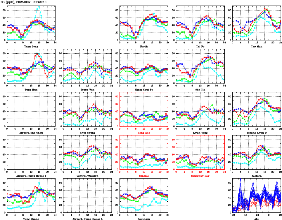 | Air Quality Data Time Series for O3 (2025/10/10) | ( Line colors: Day -3 Day -2 Day -1 Current day ) | 2D Map Current AQHI |