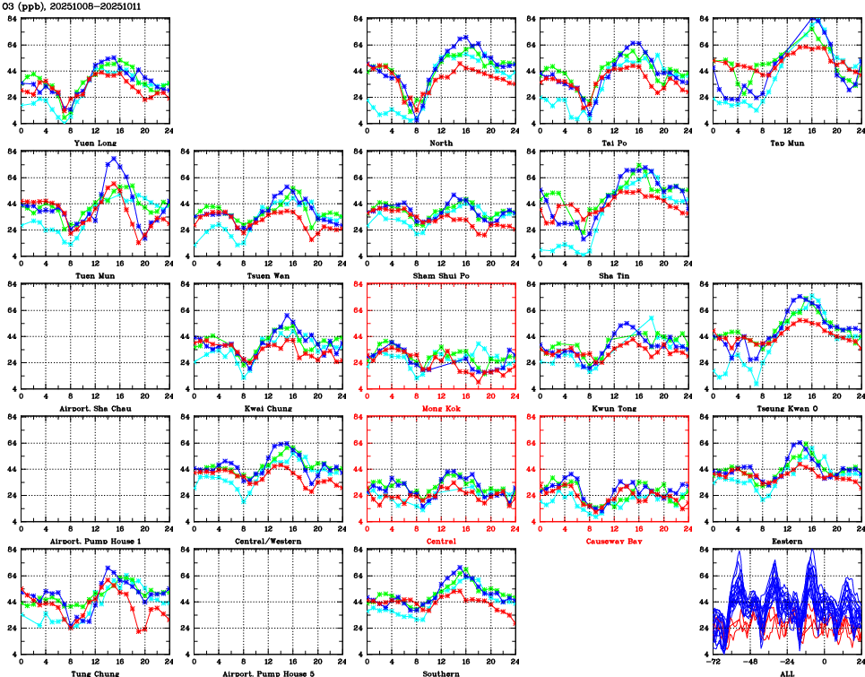 | Air Quality Data Time Series for O3 (2025/10/11) | ( Line colors: Day -3 Day -2 Day -1 Current day ) | 2D Map Current AQHI |
