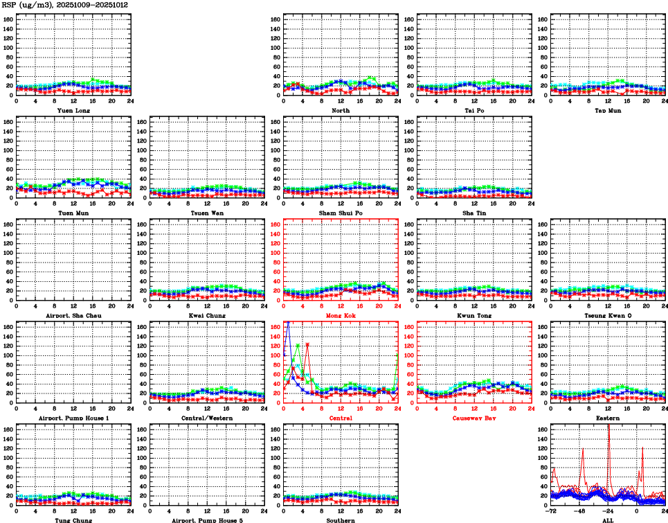 | Air Quality Data Time Series for RSP (2025/10/12) | ( Line colors: Day -3 Day -2 Day -1 Current day ) | 2D Map Current AQHI |