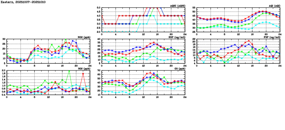 | Air Quality Data Time Series in Eastern (2025/10/10) | ( Line colors: Day -3 Day -2 Day -1 Current day ) | 2D Map Current AQHI |