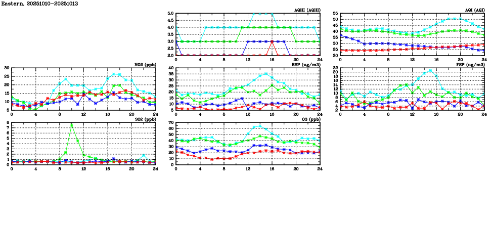 | Air Quality Data Time Series in Eastern (2025/10/13) | ( Line colors: Day -3 Day -2 Day -1 Current day ) | 2D Map Current AQHI |