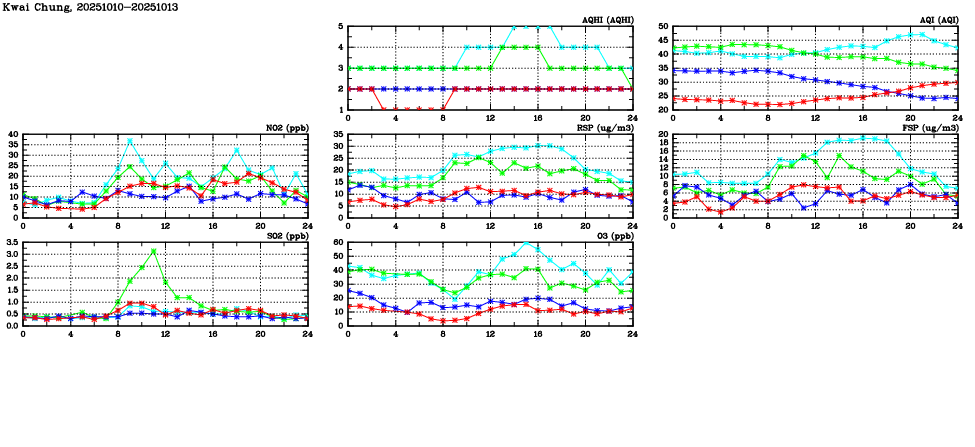 | Air Quality Data Time Series in Kwai Chung (2025/10/13) | ( Line colors: Day -3 Day -2 Day -1 Current day ) | 2D Map Current AQHI |
