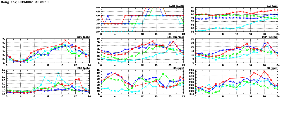 | Air Quality Data Time Series in Mong Kok (2025/10/10) | ( Line colors: Day -3 Day -2 Day -1 Current day ) | 2D Map Current AQHI |