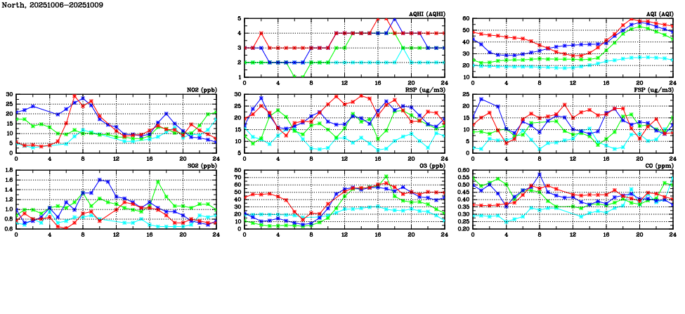 | Air Quality Data Time Series in North (2025/10/09) | ( Line colors: Day -3 Day -2 Day -1 Current day ) | 2D Map Current AQHI |