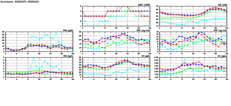 | Air Quality Data Time Series in Southern (2025/10/10) | ( Line colors: Day -3 Day -2 Day -1 Current day ) | 2D Map Current AQHI |