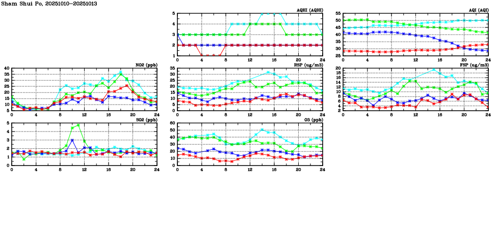 | Air Quality Data Time Series in Sham Shui Po (2025/10/13) | ( Line colors: Day -3 Day -2 Day -1 Current day ) | 2D Map Current AQHI |