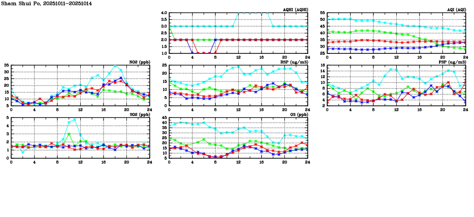 | Air Quality Data Time Series in Sham Shui Po (2025/10/14) | ( Line colors: Day -3 Day -2 Day -1 Current day ) | 2D Map Current AQHI |