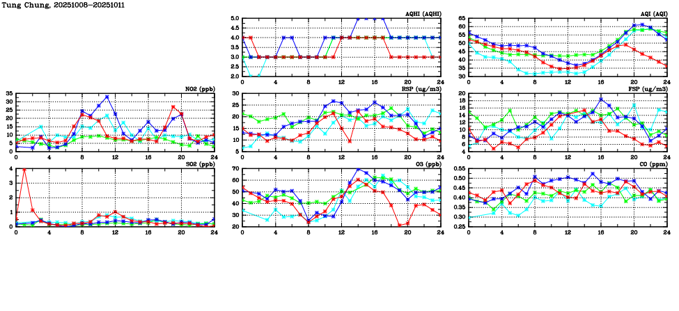 | Air Quality Data Time Series in Tung Chung (2025/10/11) | ( Line colors: Day -3 Day -2 Day -1 Current day ) | 2D Map Current AQHI |