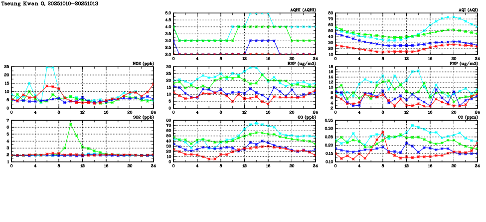 | Air Quality Data Time Series in Tseung Kwan O (2025/10/13) | ( Line colors: Day -3 Day -2 Day -1 Current day ) | 2D Map Current AQHI |