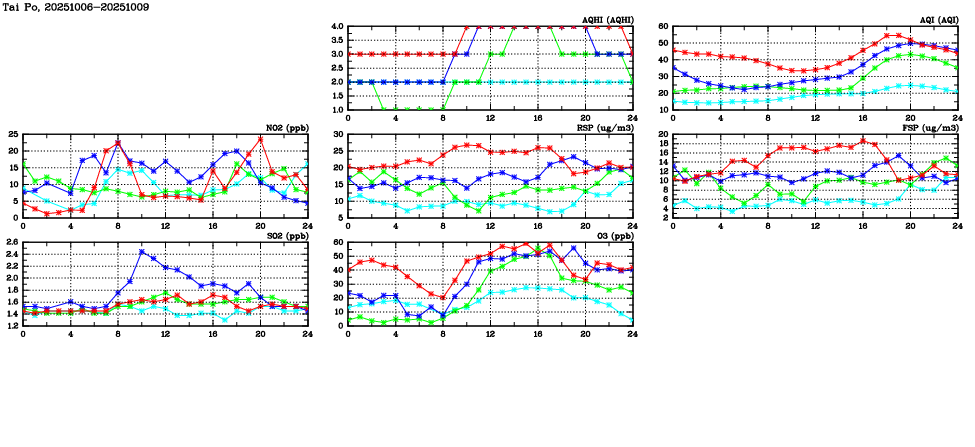 | Air Quality Data Time Series in Tai Po (2025/10/09) | ( Line colors: Day -3 Day -2 Day -1 Current day ) | 2D Map Current AQHI |
