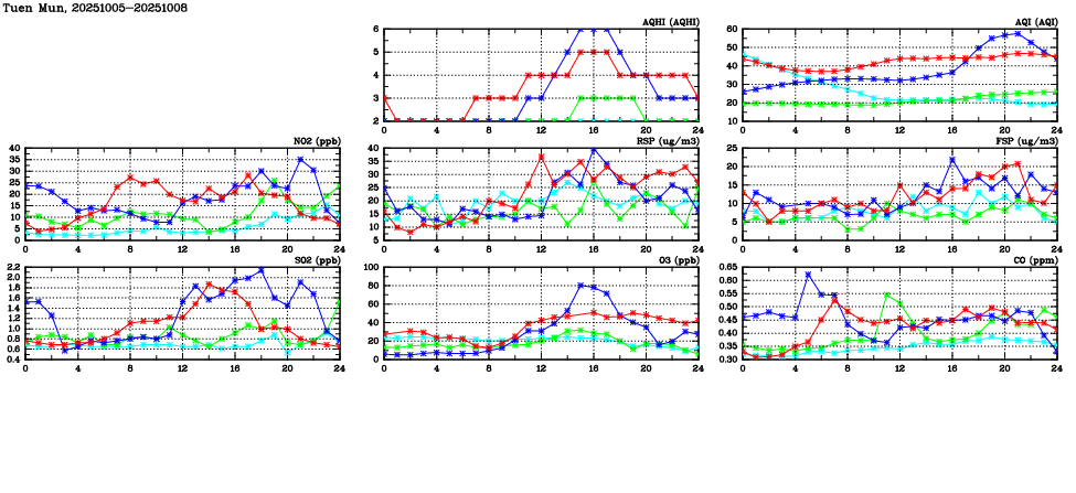 | Parameters: | AQHI | AQI | RSP | FSP | NO2 | SO2 | O3 | CO | Temp | WS | WD |