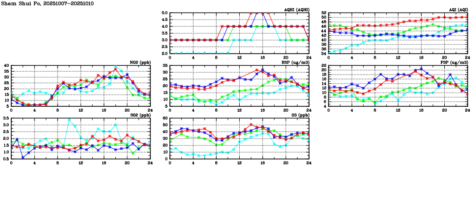 | Air Quality Data Time Series in Sham Shui Po (2025/10/10) | ( Line colors: Day -3 Day -2 Day -1 Current day ) | 2D Map Current AQHI |