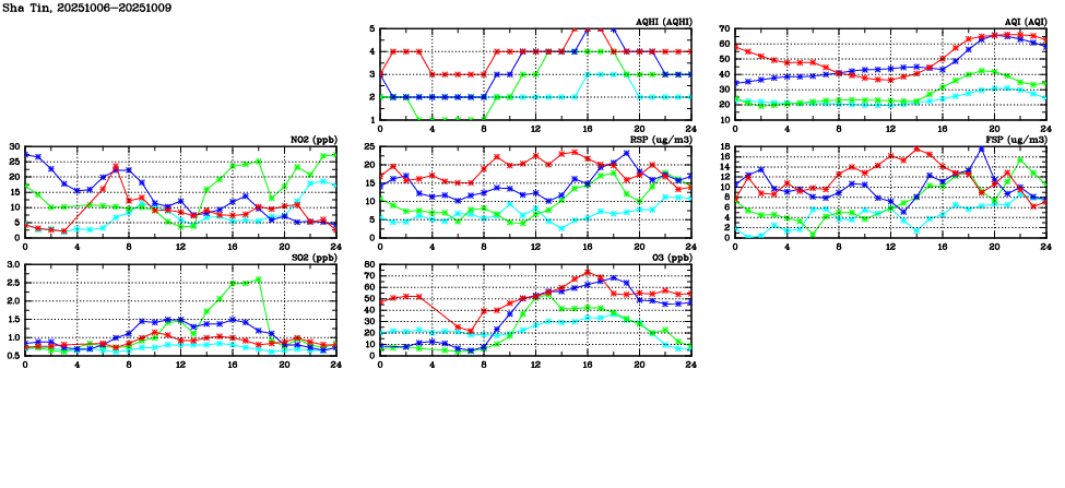 | Air Quality Data Time Series in Sha Tin (2025/10/09) | ( Line colors: Day -3 Day -2 Day -1 Current day ) | 2D Map Current AQHI |
