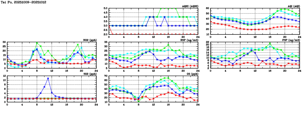 | Air Quality Data Time Series in Tai Po (2025/10/12) | ( Line colors: Day -3 Day -2 Day -1 Current day ) | 2D Map Current AQHI |