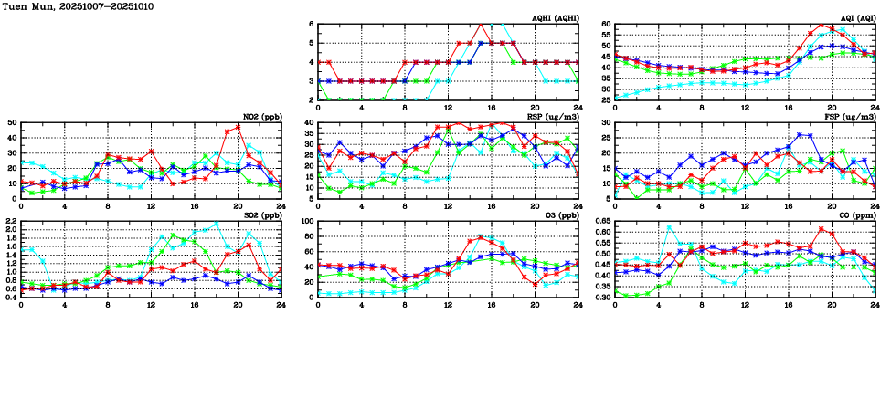| Air Quality Data Time Series in Tuen Mun (2025/10/10) | ( Line colors: Day -3 Day -2 Day -1 Current day ) | 2D Map Current AQHI |