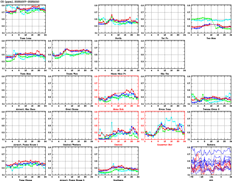 | Air Quality Data Time Series for CO (2025/10/10) | ( Line colors: Day -3 Day -2 Day -1 Current day ) | 2D Map Current AQHI |