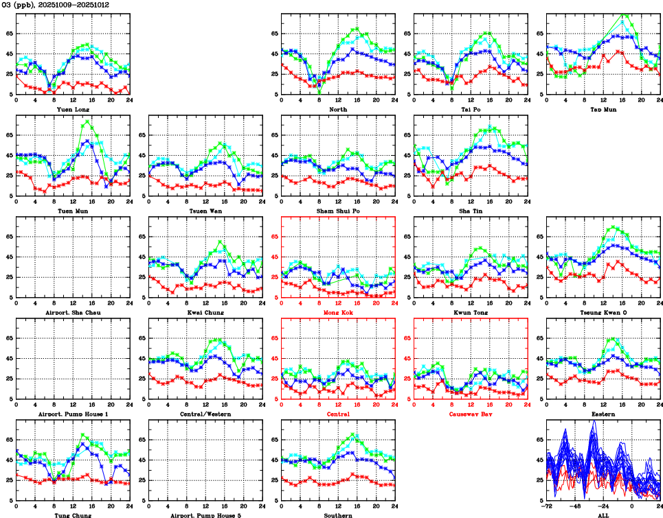 | Air Quality Data Time Series for O3 (2025/10/12) | ( Line colors: Day -3 Day -2 Day -1 Current day ) | 2D Map Current AQHI |