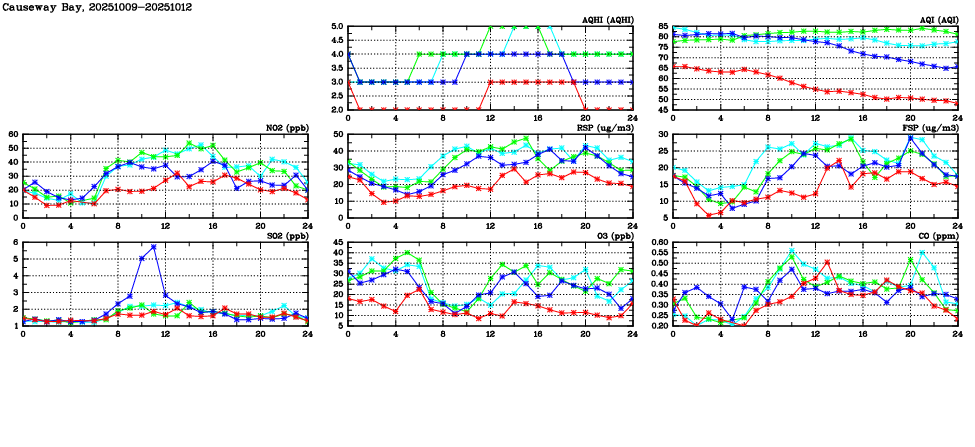 | Air Quality Data Time Series in Causeway Bay (2025/10/12) | ( Line colors: Day -3 Day -2 Day -1 Current day ) | 2D Map Current AQHI |