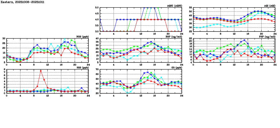 | Air Quality Data Time Series in Eastern (2025/10/11) | ( Line colors: Day -3 Day -2 Day -1 Current day ) | 2D Map Current AQHI |