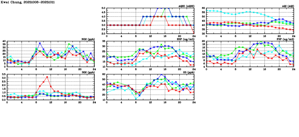 | Air Quality Data Time Series in Kwai Chung (2025/10/11) | ( Line colors: Day -3 Day -2 Day -1 Current day ) | 2D Map Current AQHI |