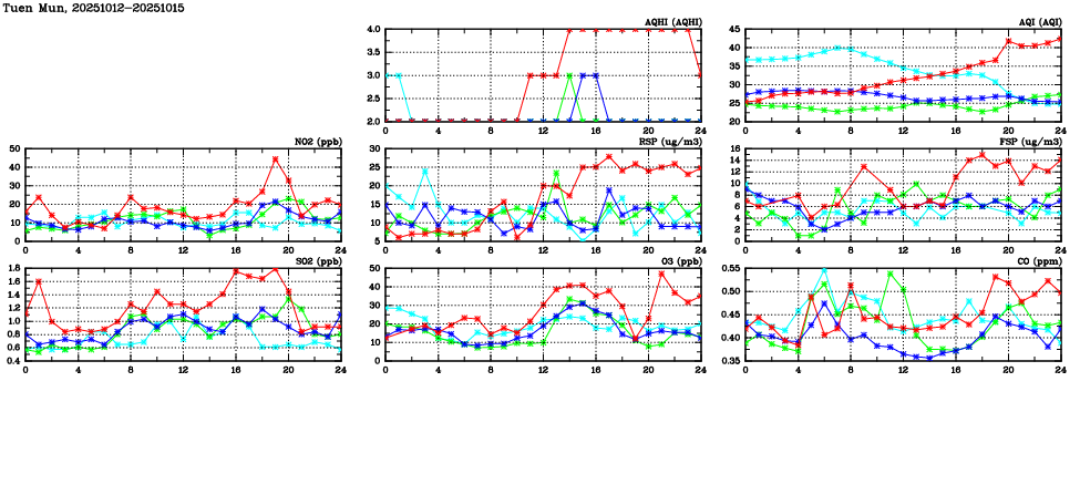 | Air Quality Data Time Series in Tuen Mun (2025/10/15) | ( Line colors: Day -3 Day -2 Day -1 Current day ) | 2D Map Current AQHI |