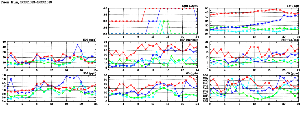 | Parameters: | AQHI | AQI | RSP | FSP | NO2 | SO2 | O3 | CO | Temp | WS | WD |