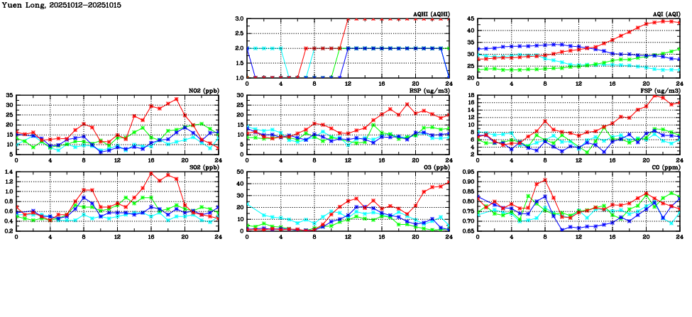 | Air Quality Data Time Series in Yuen Long (2025/10/15) | ( Line colors: Day -3 Day -2 Day -1 Current day ) | 2D Map Current AQHI |