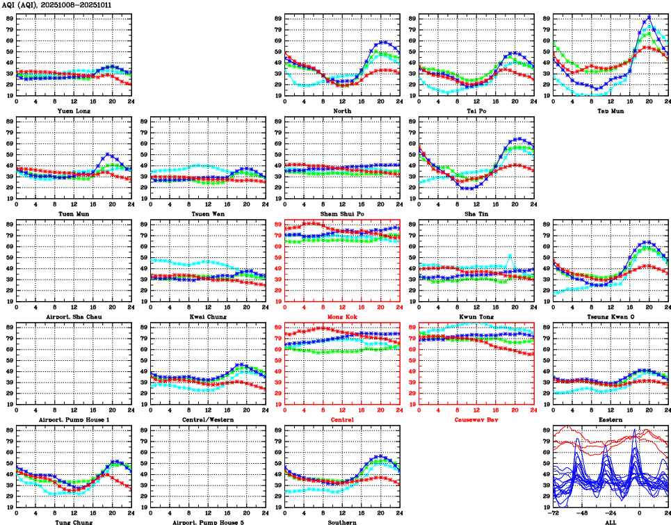| Air Quality Data Time Series for AQI (2025/10/11) | ( Line colors: Day -3 Day -2 Day -1 Current day ) | 2D Map Current AQHI |