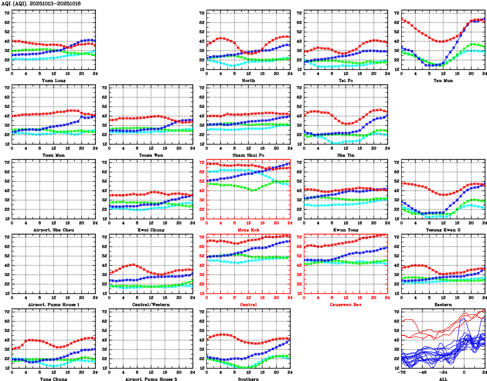 | Air Quality Data Time Series for AQI (2025/10/16) | ( Line colors: Day -3 Day -2 Day -1 Current day ) | 2D Map Current AQHI |