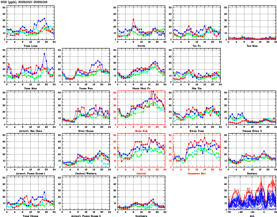 | Air Quality Data Time Series for NO2 (2025/10/16) | ( Line colors: Day -3 Day -2 Day -1 Current day ) | 2D Map Current AQHI |