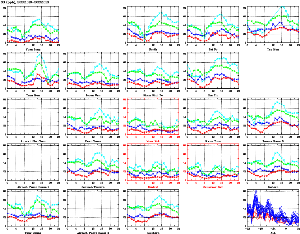 | Air Quality Data Time Series for O3 (2025/10/13) | ( Line colors: Day -3 Day -2 Day -1 Current day ) | 2D Map Current AQHI |