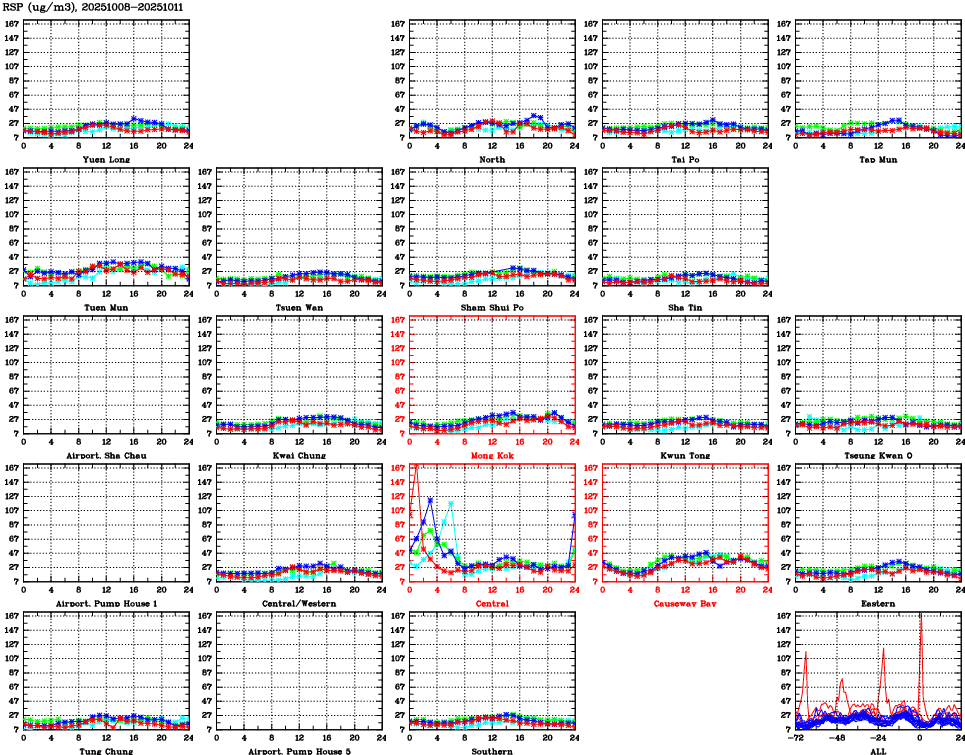 | Air Quality Data Time Series for RSP (2025/10/11) | ( Line colors: Day -3 Day -2 Day -1 Current day ) | 2D Map Current AQHI |