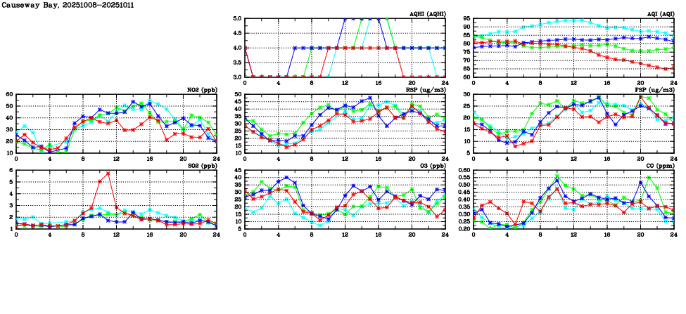| Air Quality Data Time Series in Causeway Bay (2025/10/11) | ( Line colors: Day -3 Day -2 Day -1 Current day ) | 2D Map Current AQHI |
