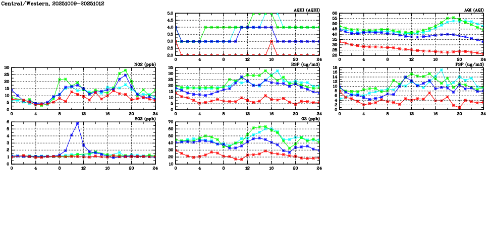 | Air Quality Data Time Series in Central/Western (2025/10/12) | ( Line colors: Day -3 Day -2 Day -1 Current day ) | 2D Map Current AQHI |