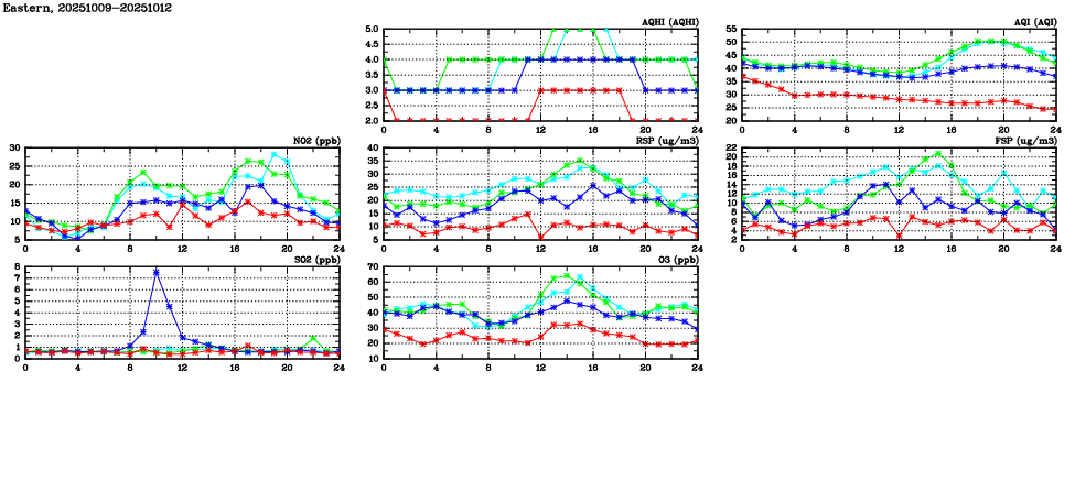 | Air Quality Data Time Series in Eastern (2025/10/12) | ( Line colors: Day -3 Day -2 Day -1 Current day ) | 2D Map Current AQHI |