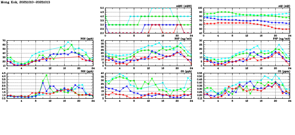 | Air Quality Data Time Series in Mong Kok (2025/10/13) | ( Line colors: Day -3 Day -2 Day -1 Current day ) | 2D Map Current AQHI |