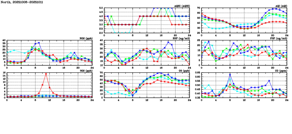 | Air Quality Data Time Series in North (2025/10/11) | ( Line colors: Day -3 Day -2 Day -1 Current day ) | 2D Map Current AQHI |
