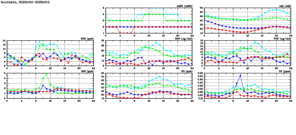 | Air Quality Data Time Series in Southern (2025/10/13) | ( Line colors: Day -3 Day -2 Day -1 Current day ) | 2D Map Current AQHI |