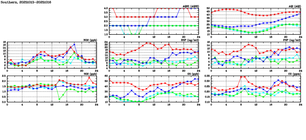 | Air Quality Data Time Series in Southern (2025/10/16) | ( Line colors: Day -3 Day -2 Day -1 Current day ) | 2D Map Current AQHI |