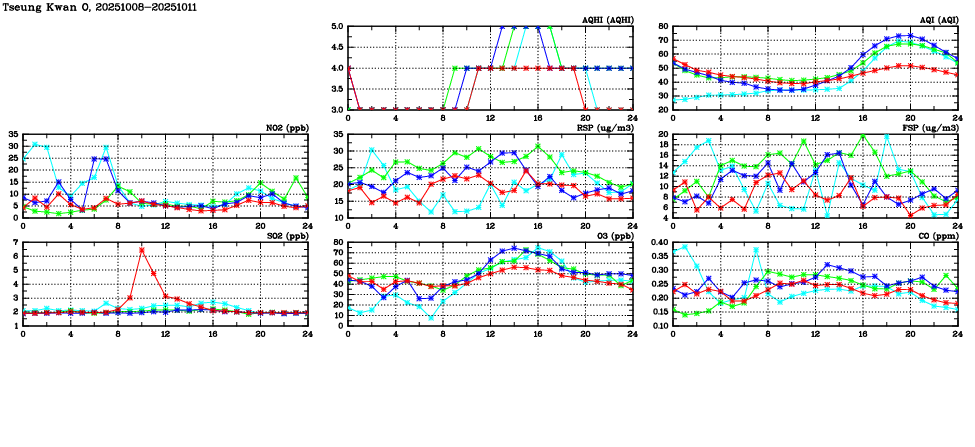 | Air Quality Data Time Series in Tseung Kwan O (2025/10/11) | ( Line colors: Day -3 Day -2 Day -1 Current day ) | 2D Map Current AQHI |