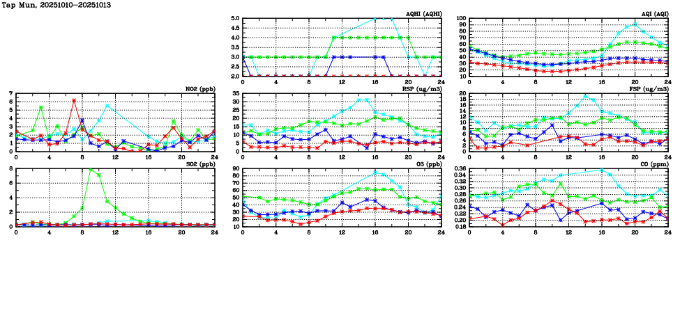 | Air Quality Data Time Series in Tap Mun (2025/10/13) | ( Line colors: Day -3 Day -2 Day -1 Current day ) | 2D Map Current AQHI |