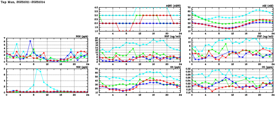 | Air Quality Data Time Series in Tap Mun (2025/10/14) | ( Line colors: Day -3 Day -2 Day -1 Current day ) | 2D Map Current AQHI |