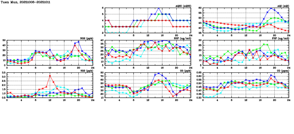 | Air Quality Data Time Series in Tuen Mun (2025/10/11) | ( Line colors: Day -3 Day -2 Day -1 Current day ) | 2D Map Current AQHI |