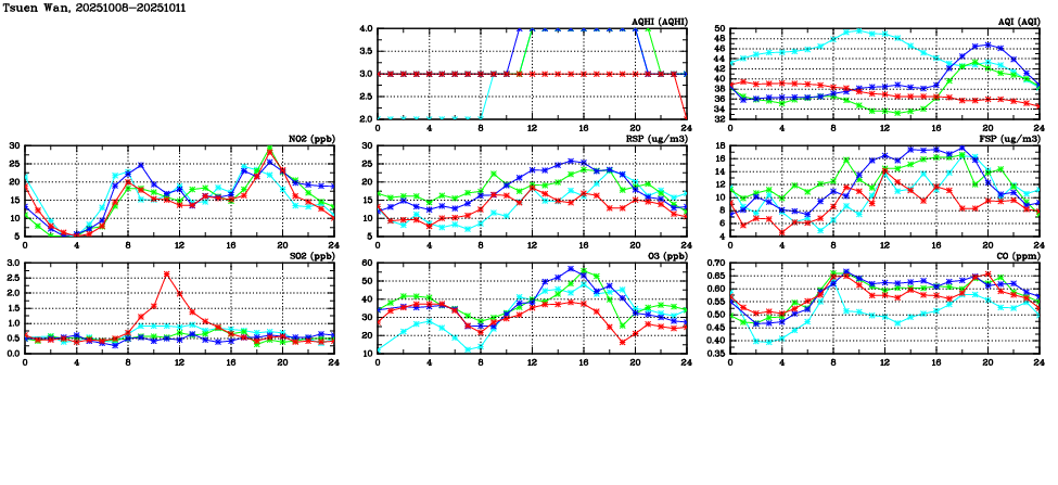 | Air Quality Data Time Series in Tsuen Wan (2025/10/11) | ( Line colors: Day -3 Day -2 Day -1 Current day ) | 2D Map Current AQHI |