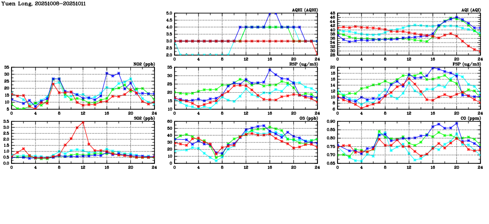 | Air Quality Data Time Series in Yuen Long (2025/10/11) | ( Line colors: Day -3 Day -2 Day -1 Current day ) | 2D Map Current AQHI |