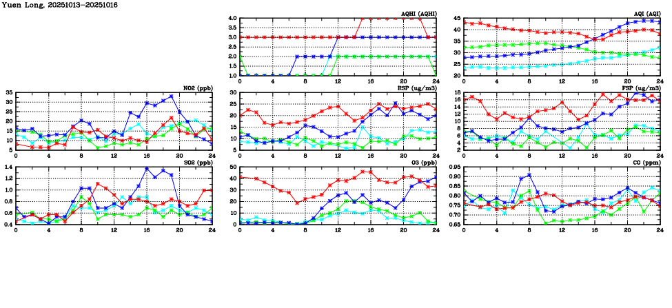 | Air Quality Data Time Series in Yuen Long (2025/10/16) | ( Line colors: Day -3 Day -2 Day -1 Current day ) | 2D Map Current AQHI |