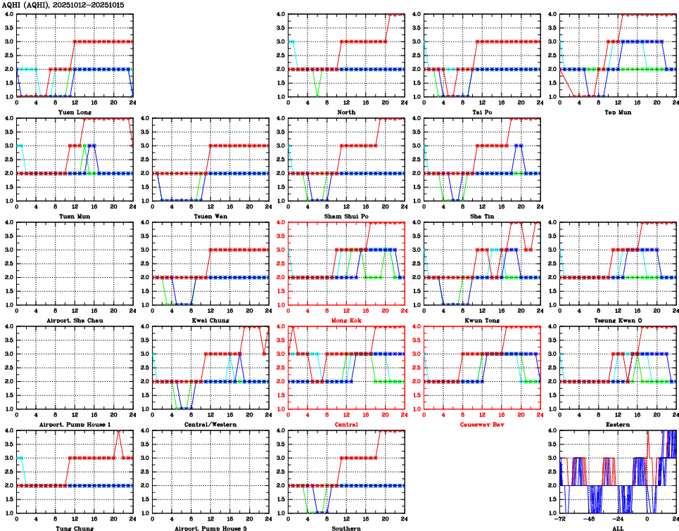 | Air Quality Data Time Series for AQHI (2025/10/15) | ( Line colors: Day -3 Day -2 Day -1 Current day ) | 2D Map Current AQHI |