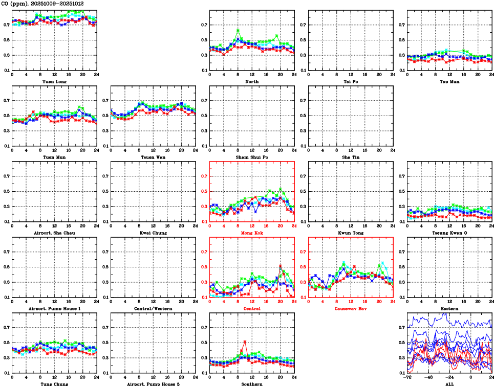| Air Quality Data Time Series for CO (2025/10/12) | ( Line colors: Day -3 Day -2 Day -1 Current day ) | 2D Map Current AQHI |