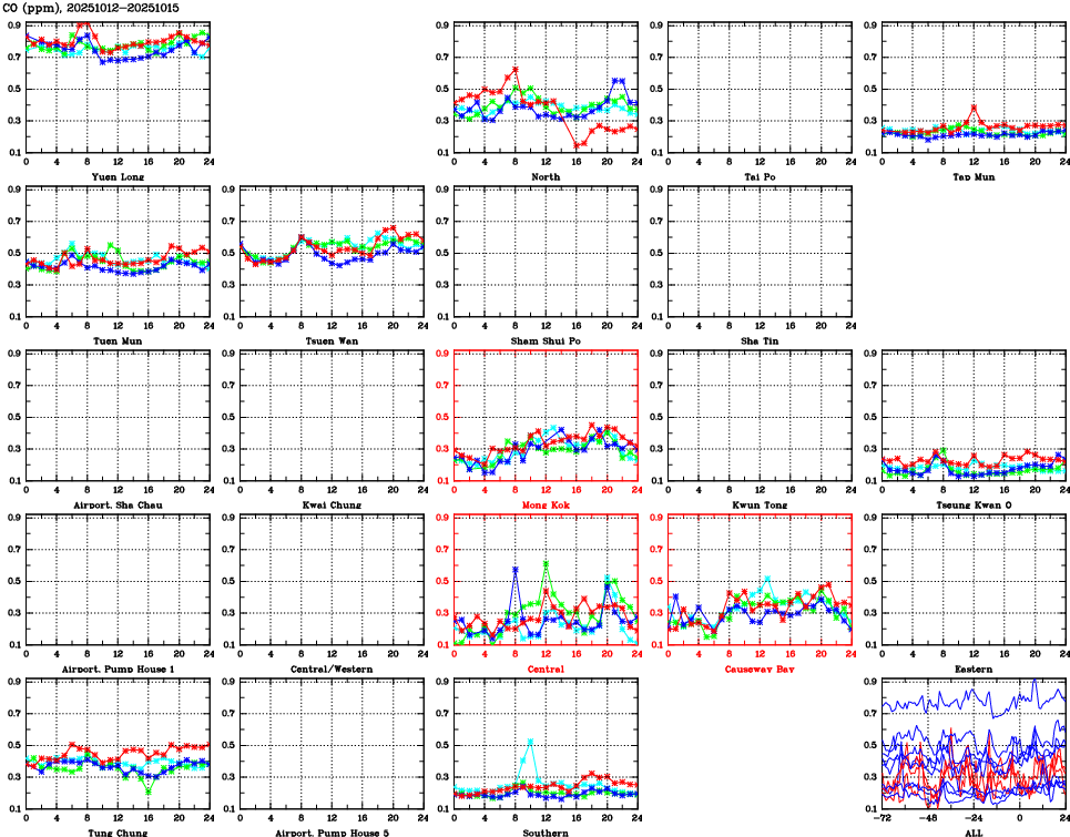 | Air Quality Data Time Series for CO (2025/10/15) | ( Line colors: Day -3 Day -2 Day -1 Current day ) | 2D Map Current AQHI |