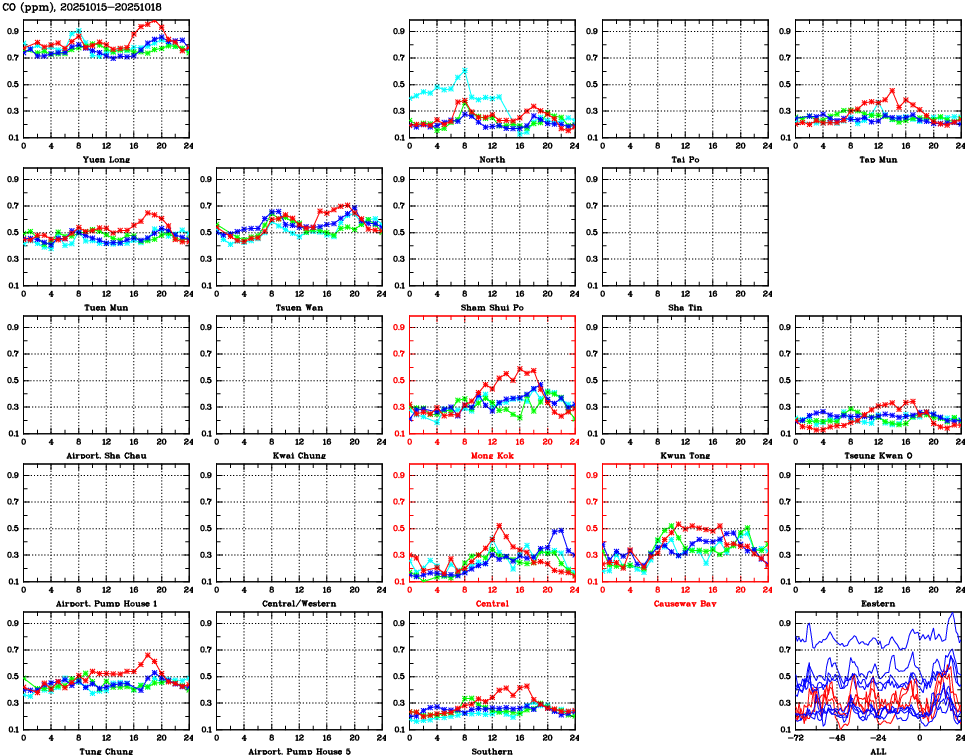 | Air Quality Data Time Series for CO (2025/10/18) | ( Line colors: Day -3 Day -2 Day -1 Current day ) | 2D Map Current AQHI |